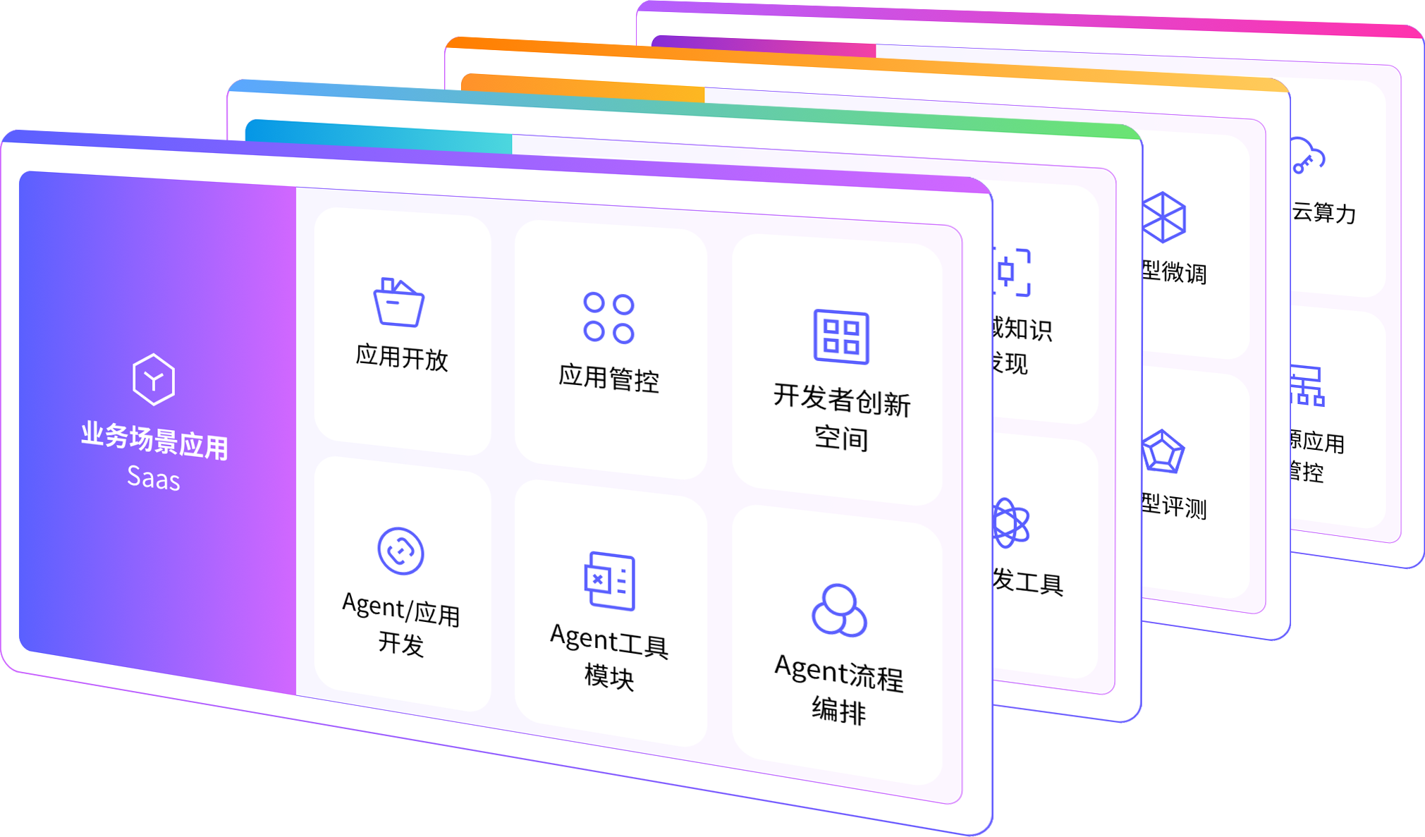 支持增强型、智能体、数据型、写作型等多种应用形态,灵活接入业务系统,快速实现场景落地。